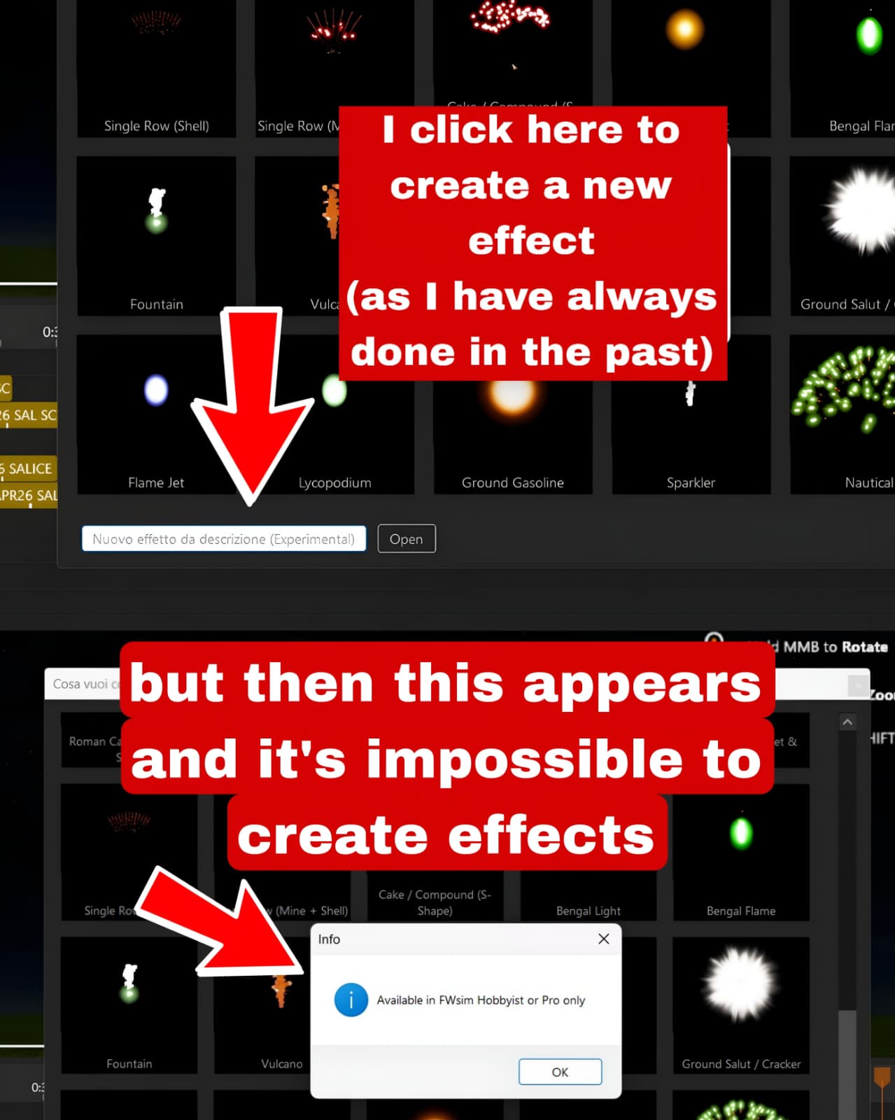 Hi, I have an issue when I try to generate new effects. As you can notice from the picture, before I updated FW Sim to the 4.3 version, it was all okay when I had to create effects. Now that I installed the 4.3 version, when I open the menu with all fireworks effects and want to create a new one, it says: “New effect from description (Experimental),” a function exclusive for Hobbyist and Pro, while I have the basic plan. My question is, how can I fix this and keep creating effects by myself? Hope someone can help me.